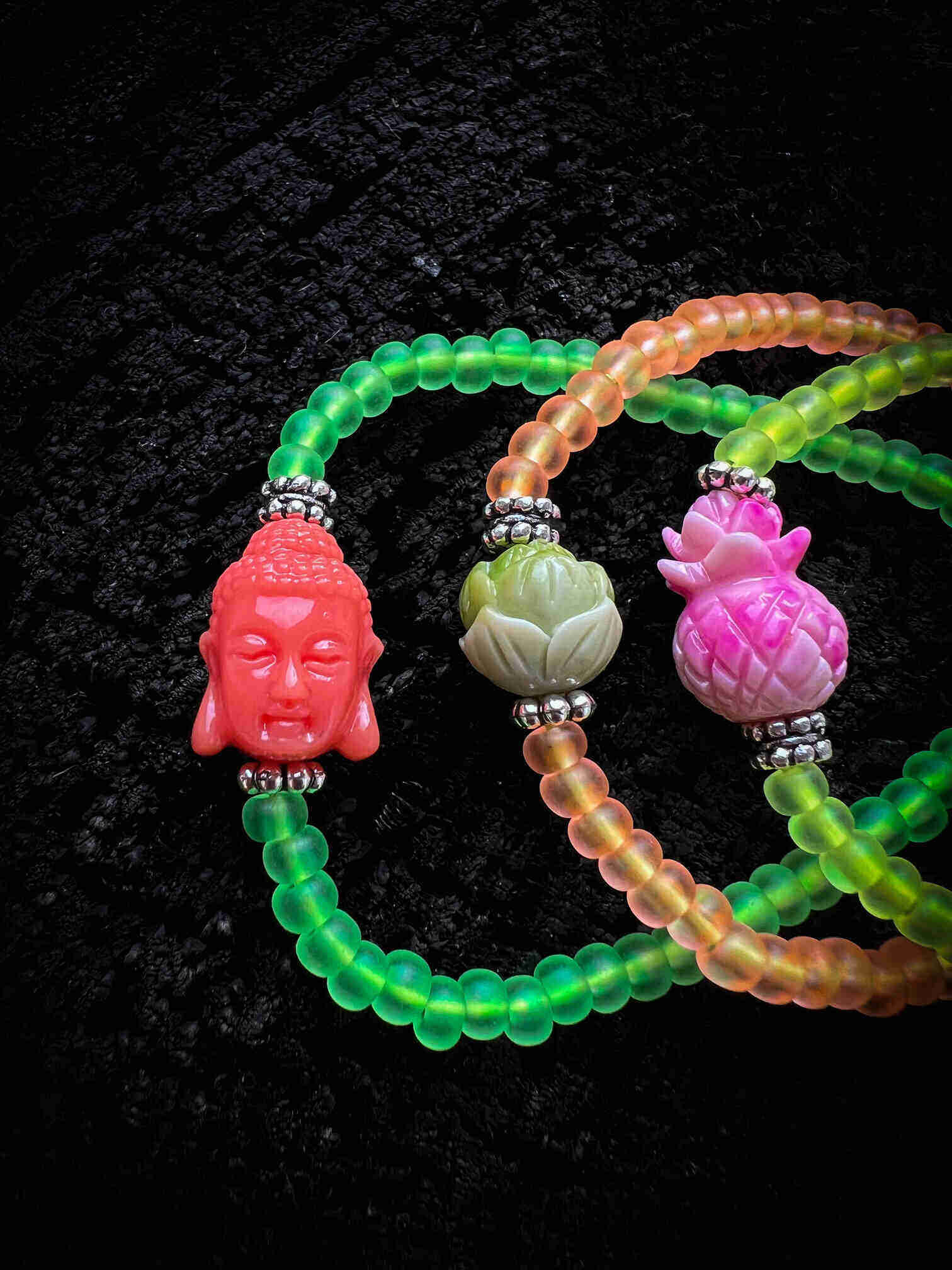 Barevné Náramky Set Oživte svůj styl s naším barevným náramkovým setem! Tento unikátní set zahrnuje tři náramky vyrobené ze syntetického korálu, skleněných korálů. Náramkům dominují symboly hlava Buddhy, lotus a pink ananas. Skleněné korále české výroby dodávají tomuto barevnému setu náramků eleganc... celý popis