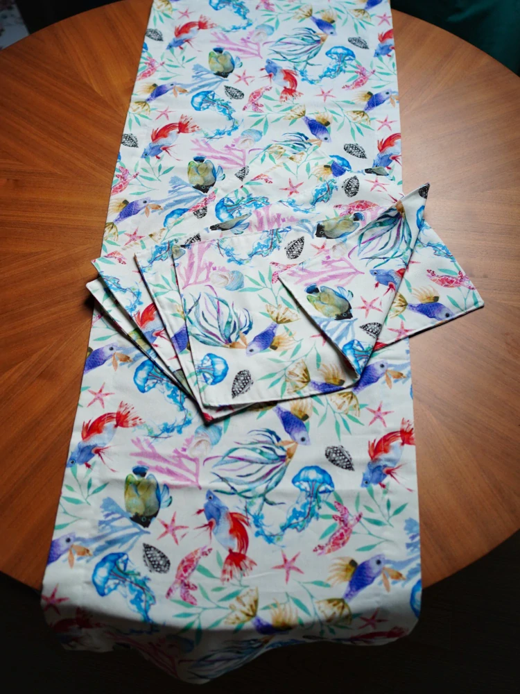 Vdechněte svému stolu svěží atmosféru moře. Toto ručně šité oboustranné prostírání přináší originální motiv ryb, medúz a dalších prvků podmořského světa, které okamžitě zpříjemní každodenní stolování i sváteční příležitosti.