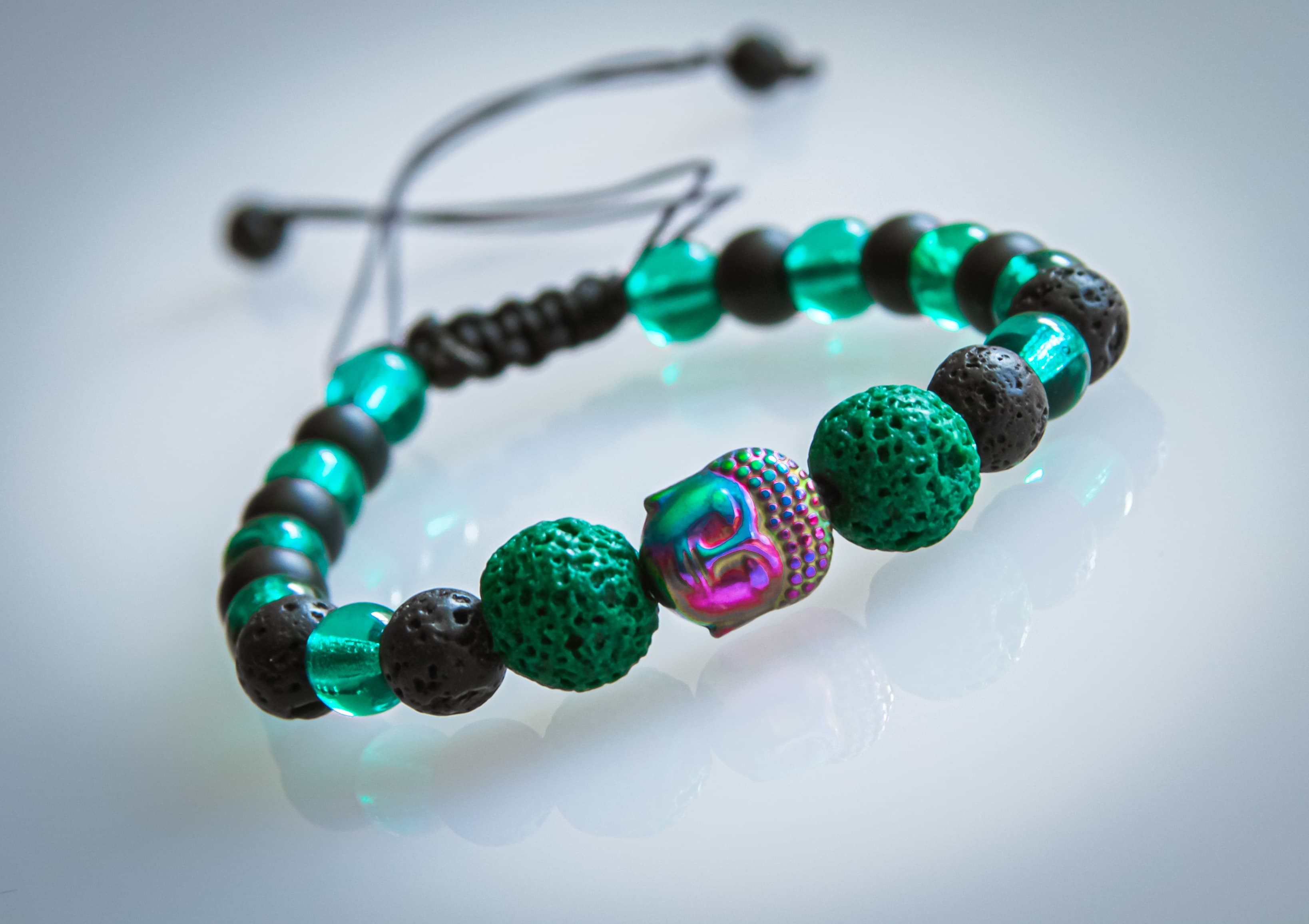 Buddha Duhový Lávový je unikátní náramek vyrobený z kombinace lávových kamenů a skleněných korálků české výroby, které se dokonale doplňují a tvoří krásný a harmonický celek.