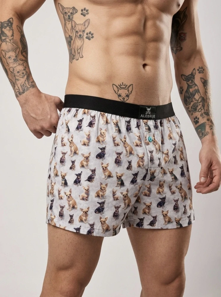 Přesně takové jsou tyto trenky s vzorem čivav a krysaříků, které spojují pohodlí, originalitu a poctivou ruční výrobu.