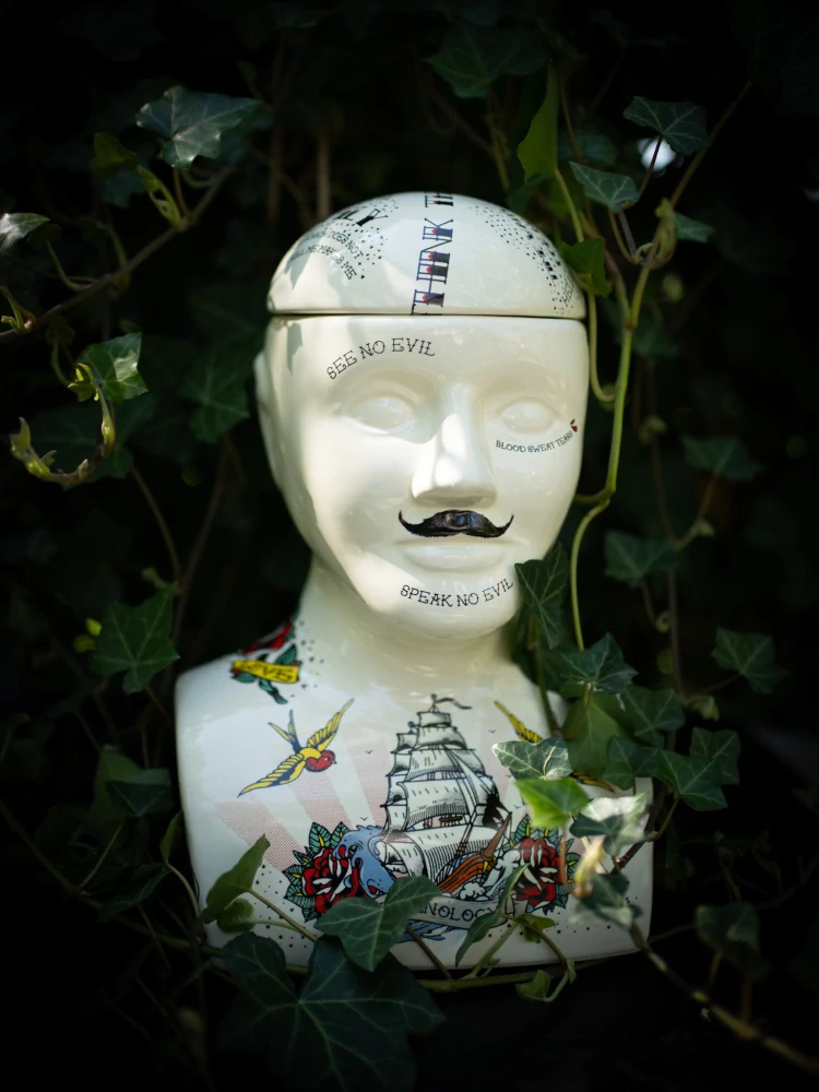 Představujeme Vám keramickou bustu, která spojuje dvě fascinující oblasti 19. století - fascinaci pseudovědou frenologií a rychlý rozmach tetování.