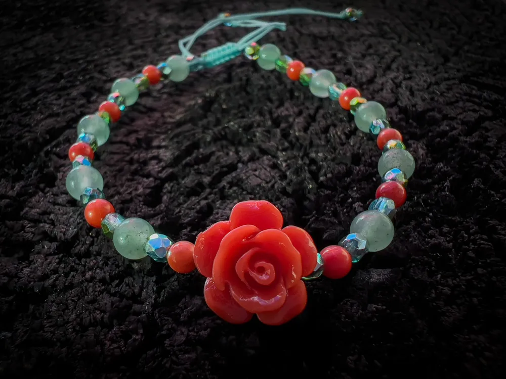 Náramku Mořská Zahrada dominuje růže ve stejné barvě jako jsou korálové korálky, což dělá tento kousek ještě výjimečnějším a dokáže vystihnout krásu přírody.