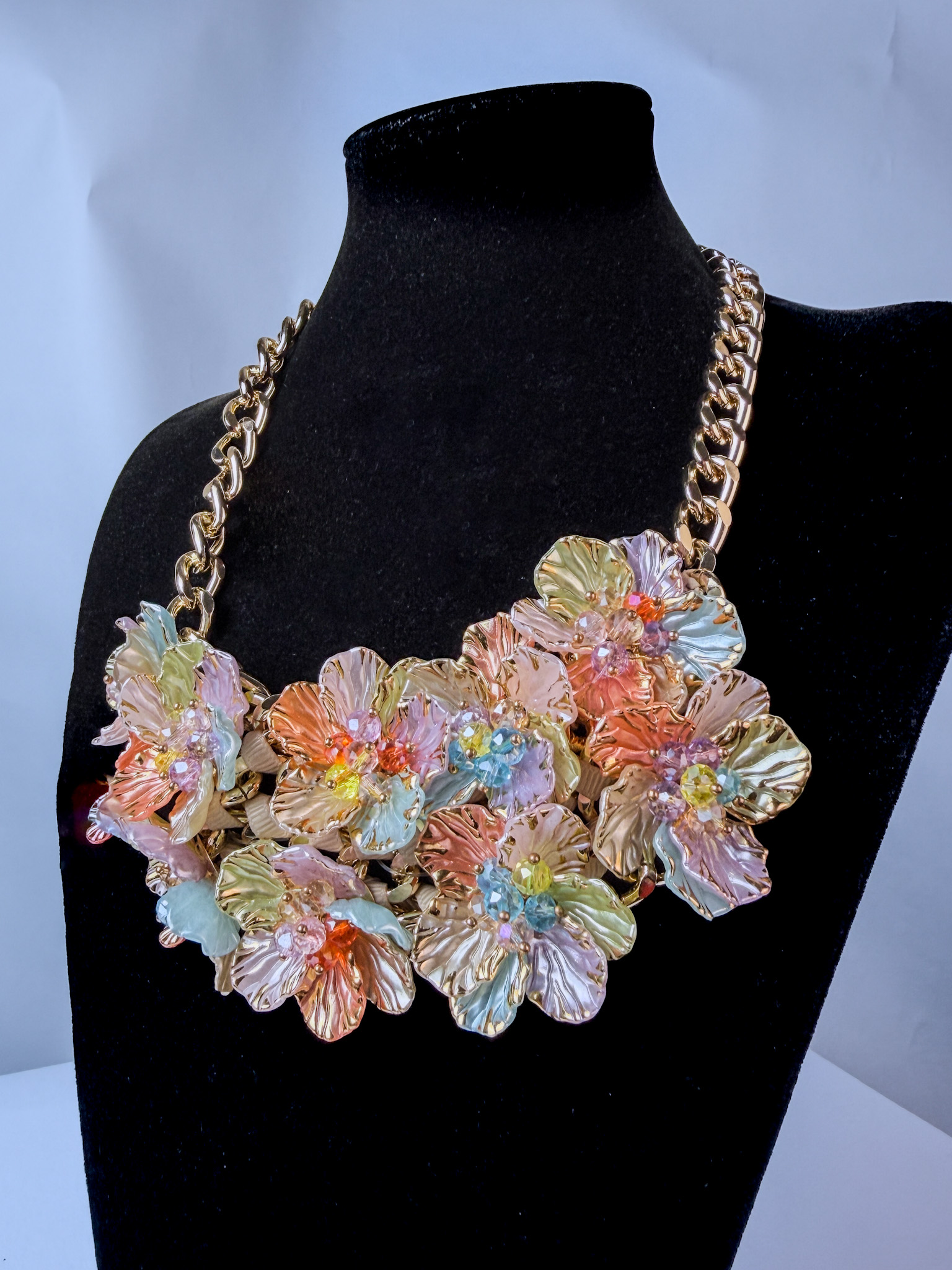 Náhrdelník Květinová harmonie je výrazný, ale jemně laděný šperk, který spojuje pastelové barvy, květinové motivy a zlatý řetěz. Působí svěže, lehce romanticky a přitom nepřehlédnutelně. Díky bohatému zdobení květy a korály zaujme na první pohled, ale stále si zachovává příjemnou rovnováhu.