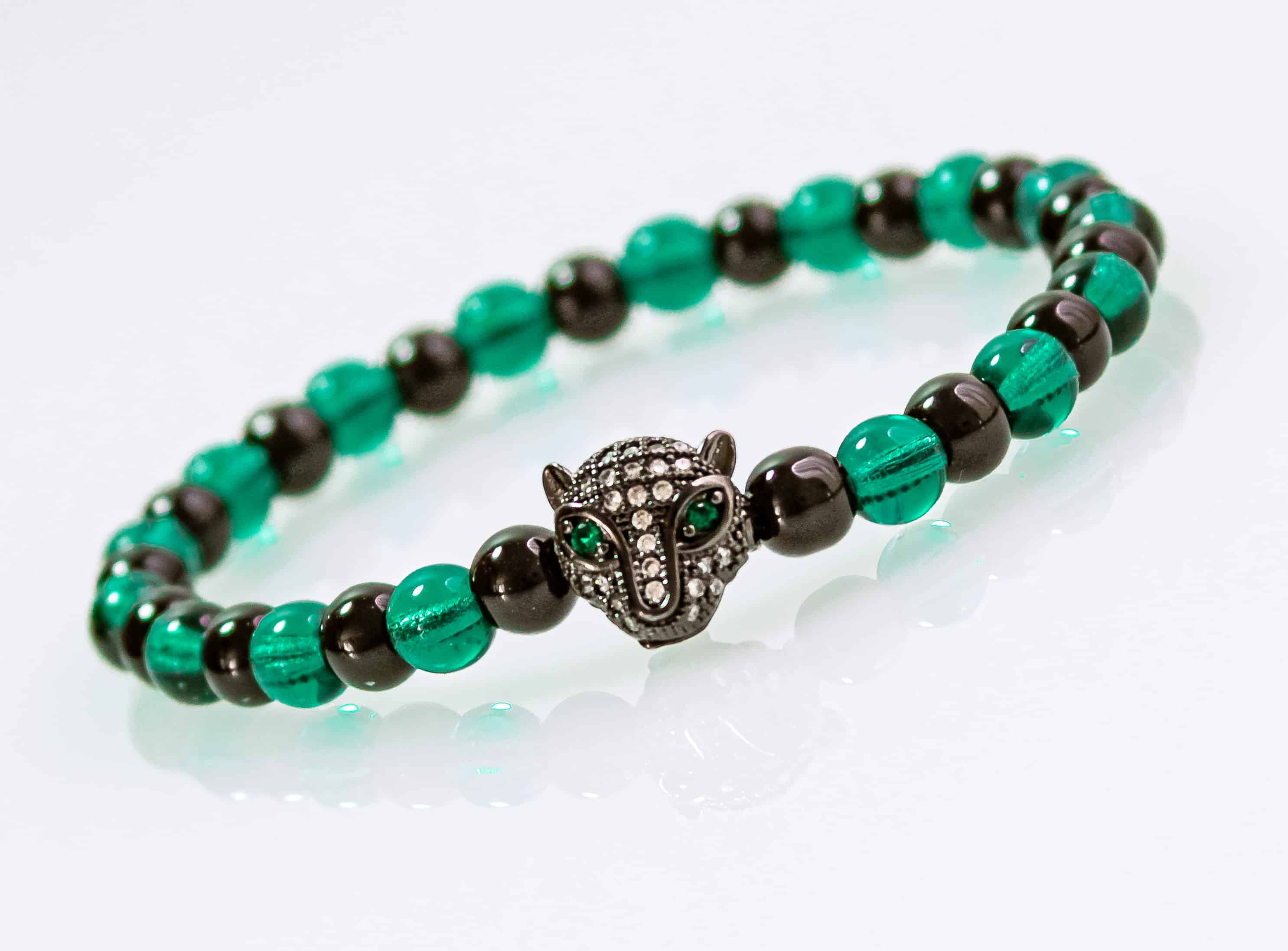Hlava pantera je krásně propracovaná včetně temně zelených očí, které mají stejnou barvu jako korále na náramku.