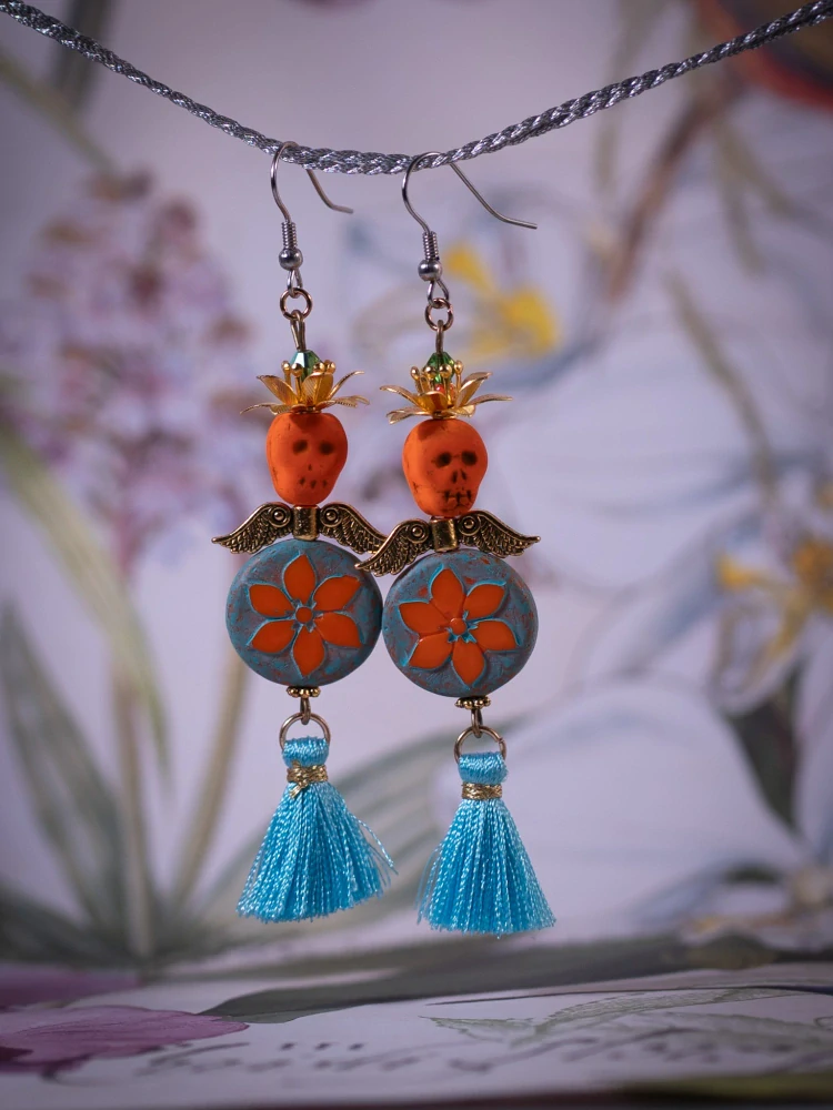 Dominujícím prvkem těchto náušnic je oranžová lebka v kombinaci květinou. Neonová lebka svítí pod UV. Barevný Mexický styl, kontrast lebky a květin, střapce a zlatý komponent.