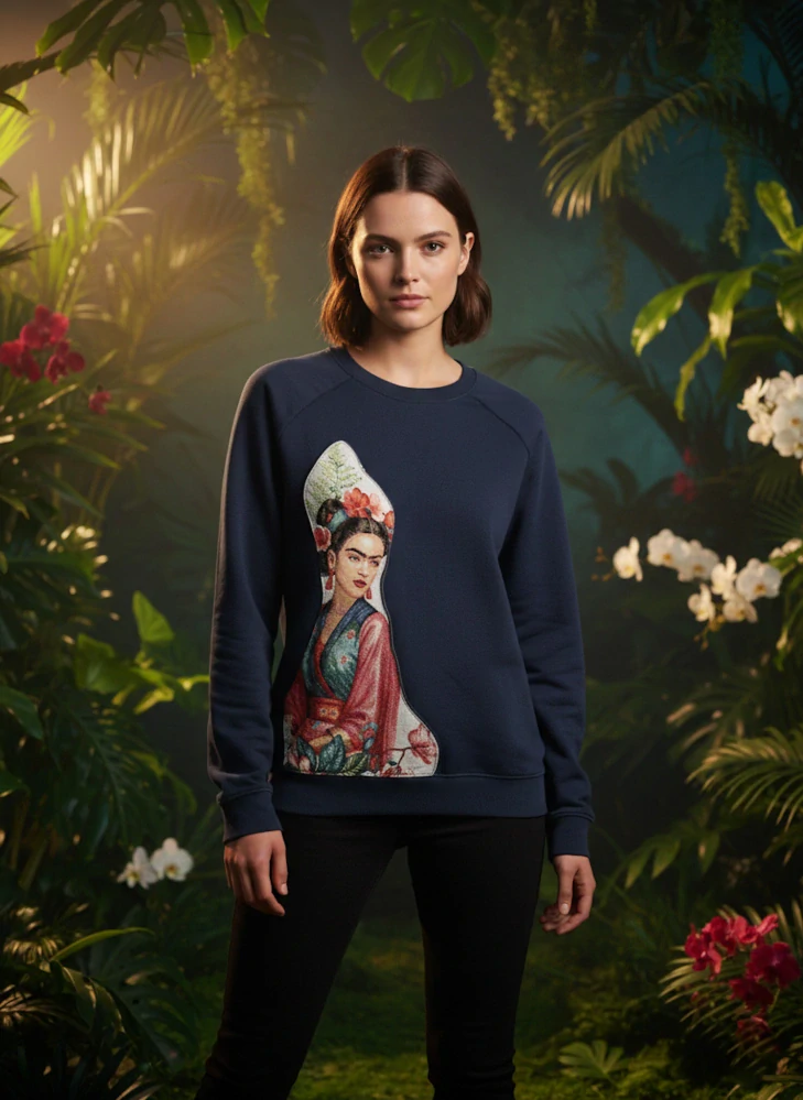Tmavě modrý základ doplňuje originální látka s motivem Fridy Kahlo, kterou jsme objevili na našich