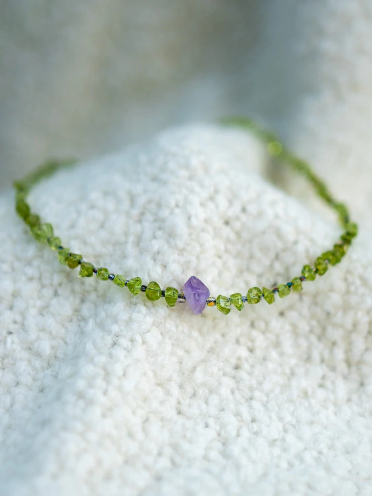 Olivín, známý také jako peridot, je kamenem růstu, vitality a pozitivní energie. Jeho zelené odstíny krásně kontrastují s fialovým ametystem a jemným leskem skleněných krystalků. Kombinace těchto prvků vytváří harmonický šperk, který ozdobí každý dekolt a zároveň přinese vnitřní rovnováhu.