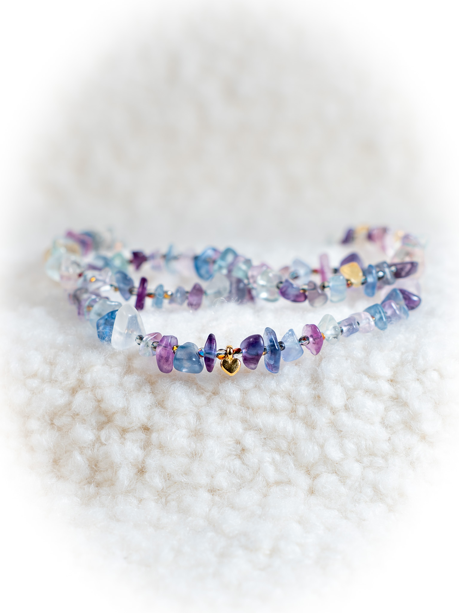 Jemný design doplňuje nádherný fluorit – kámen známý pro své překrásné odstíny.