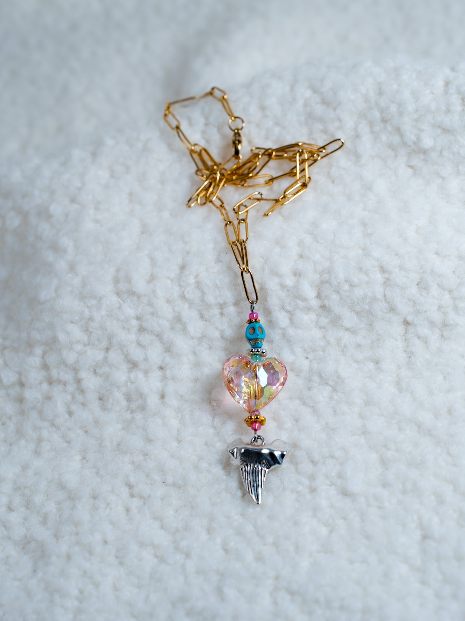 Dominantními prvky náhrdelníku žraločí zub jsou duhové srdce, žraločí zub a malá mexická lebka, což mu propůjčuje netradiční vzhled.