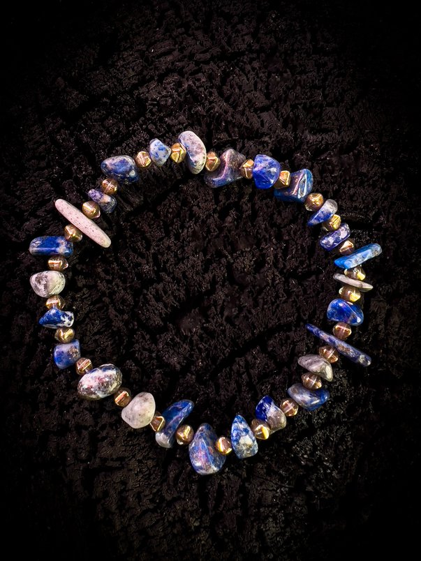 Jeho kombinace lapis lazury a skleněných korálků zlaté barvy vytváří silnou a vyváženou energii, která vám pomůže získat potřebnou rovnováhu a harmonii ve vašem životě.