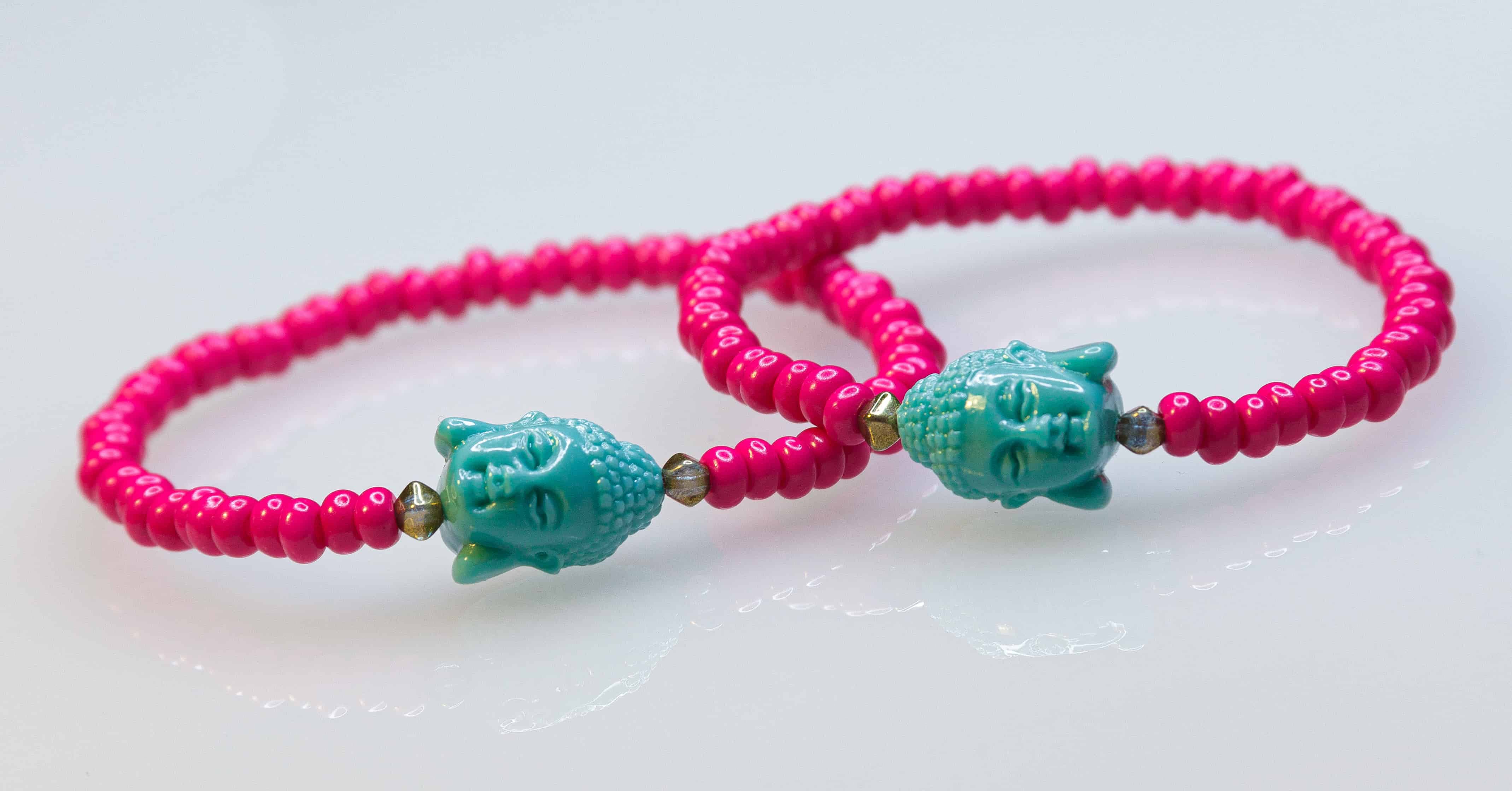 Náramek Tyrkysový Buddha Náramek Tyrkysový Buddha Růžový je vyroben z růžových korálů, které vytvářejí elegantní a orientální  vzhled. Hlavním prvkem náramku je umělecky zpracovaná hlava Buddhy tyrkysové barvy. Hlavy buddhy dodává náramku duchovní a meditační atmosféru. Náramek je navlečený na elas... celý popis