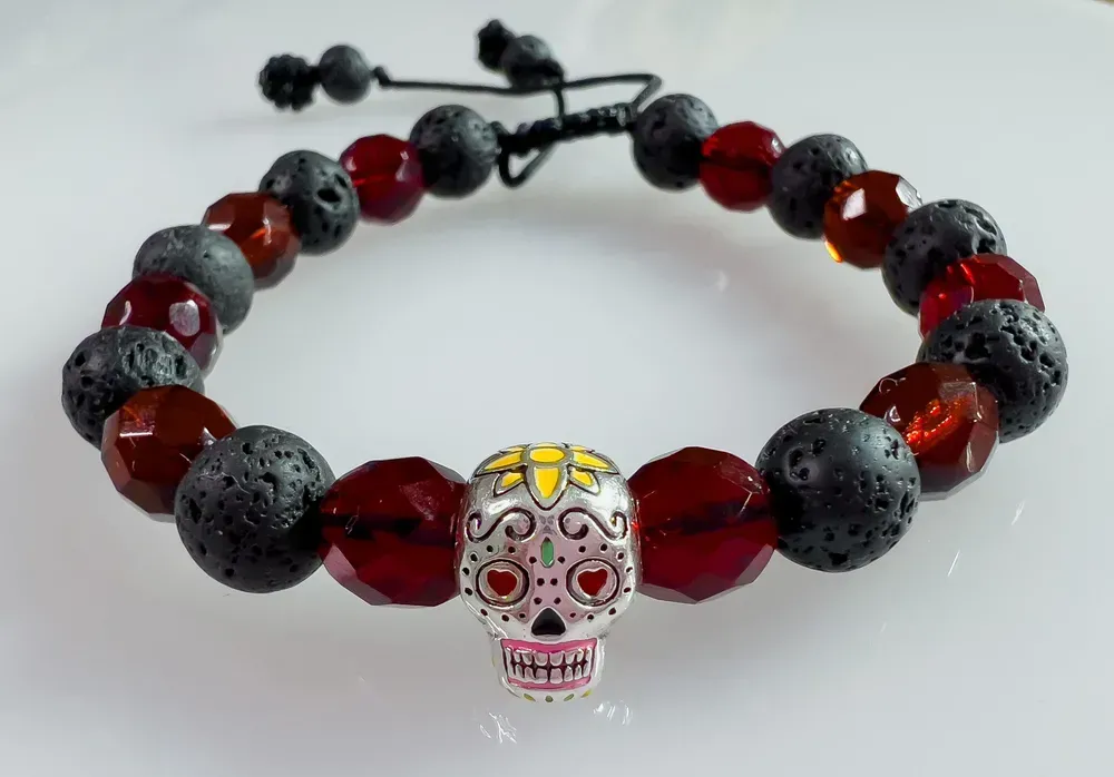 Náramek z lávových kamenů s lebkou nebo také Náramek Día de los Muertos.💀