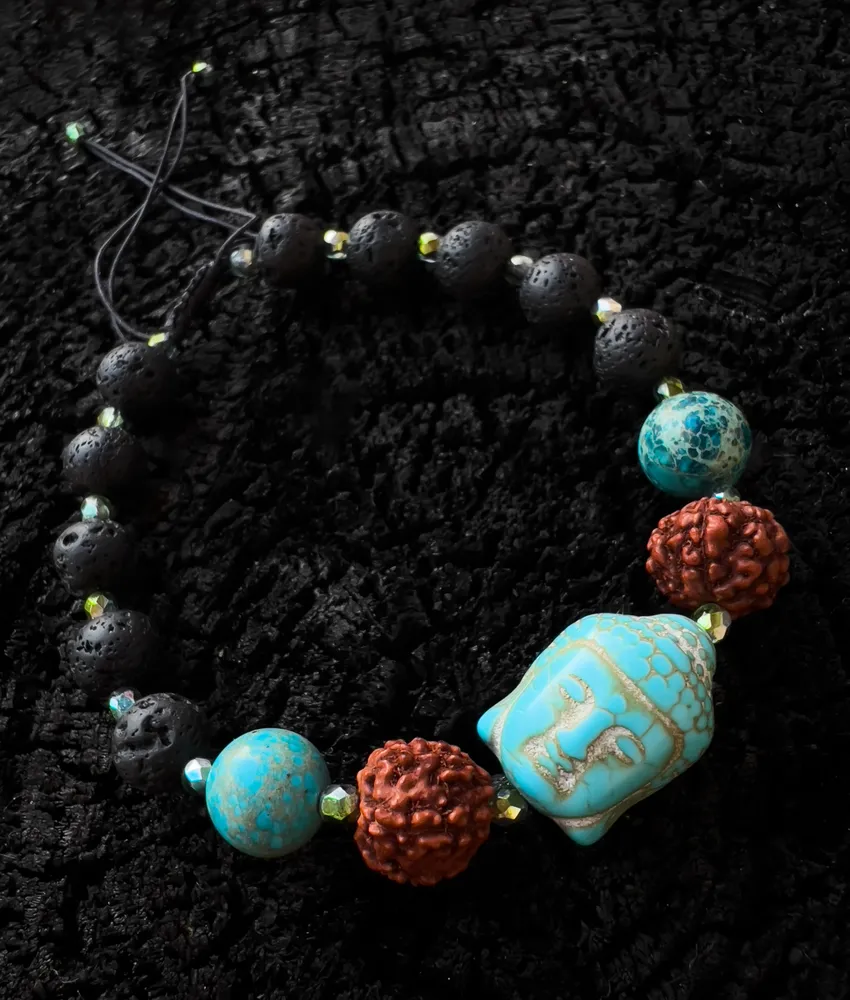 Budha je obklopen tyrkysovými jaspisovými korálky, což dodává náramku svěžest a vitálnost.