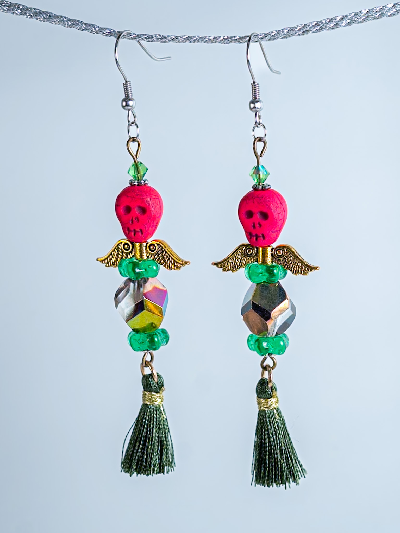 Dominujícím prvkem barevných náušnic je neonově růžová lebka. Neonová lebka svítí pod UV. Barevný Mexický styl, kontrast lebky a skleněných krystalů, střapce a zlatý komponent.