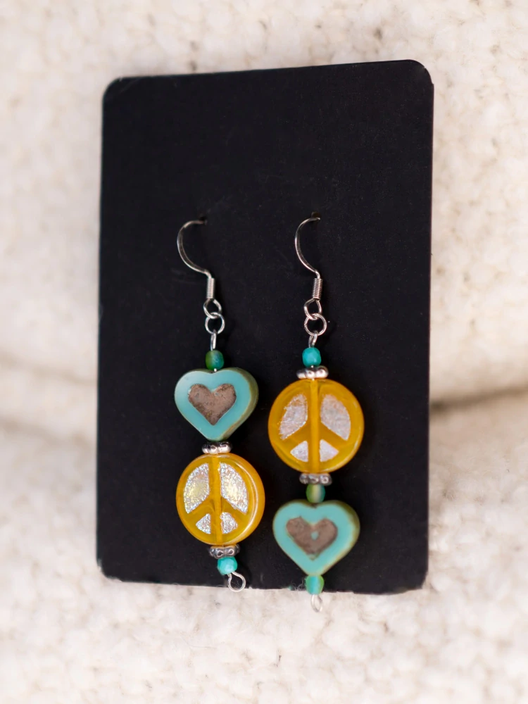 Tyto náušnice zdobí výrazný žlutý hippie symbol míru a tyrkysové skleněné srdce, které tvoří harmonickou a nepřehlédnutelnou barevnou kombinaci.