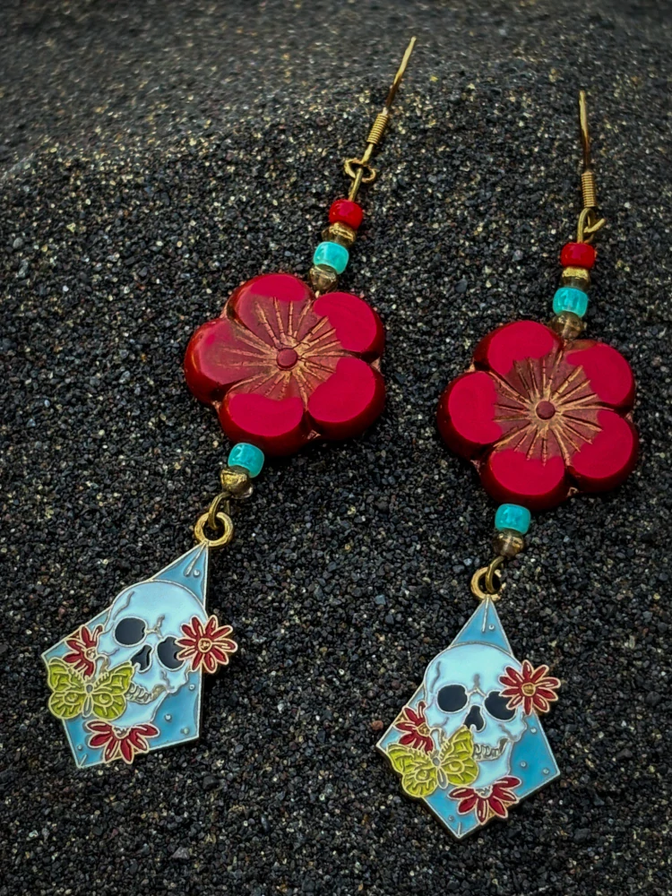 Naušnice lebky inspirované jedinečným mexickým stylem, které propojují živou barevnost s neotřelou elegancí. Dominantním prvkem těchto náušnic je skleněný červený květ, který vyrobyli čeští skláři. Rudý květ je nádherně výrazným přívěskem lebky s květinovým motivem.