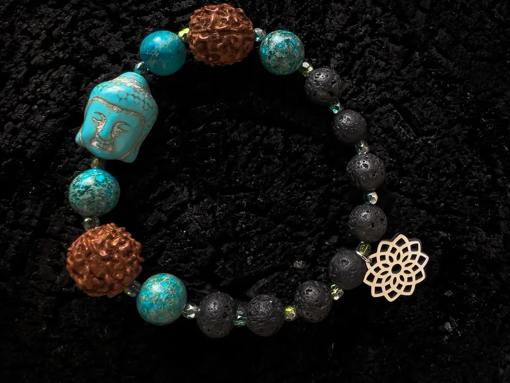 Tento náramek je vyráběn z kvalitních materiálů, včetně lávy, chirurgické oceli, jaspisu regalitu a rudrashy.
