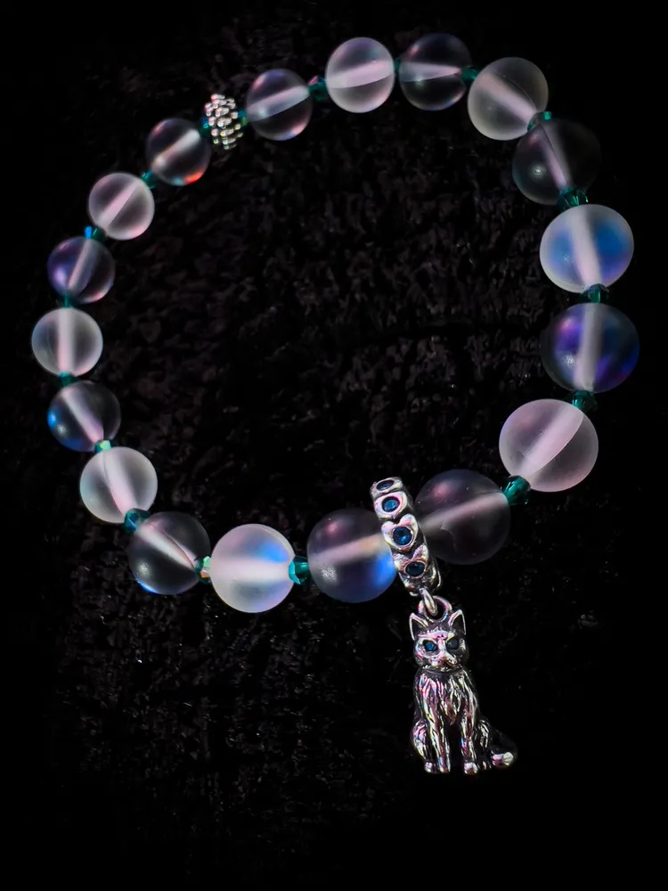 Skleněné korálky okolo měsíčních kamenů zvýrazní jemné odstíny kamene a přívěsek kočky dodá náramku jemnost a eleganci.