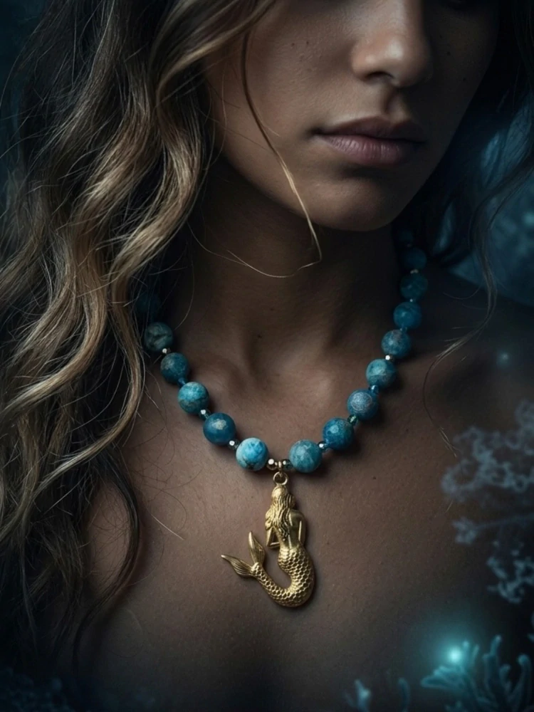 Dominantou náhrdelníku je nádherný apatit v odstínech moře, který v kombinaci s českým sklem vytváří jemnou, harmonickou barevnost připomínající oceánskou hladinu.