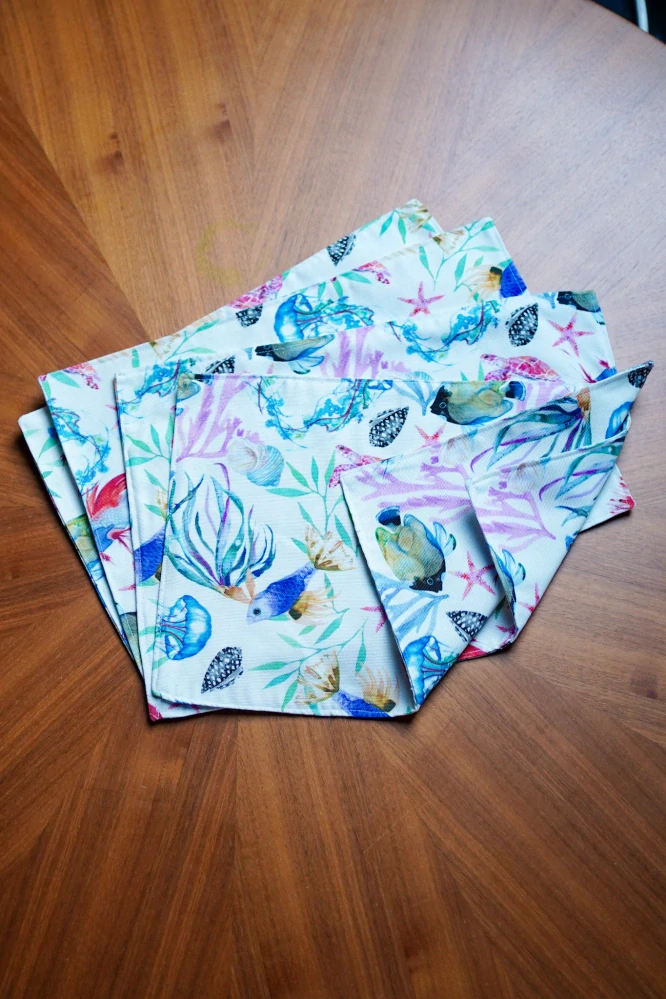 Dodejte svému stolování jedinečný styl s naším designovým setem, který zahrnuje běhoun na stůl a oboustranné prostírání pro čtyři osoby. Textilní set je inspirovaný mořem, rybami a krásou podmořského světa, díky čemuž dokonale vynikne v moderních, přírodních interiérech.