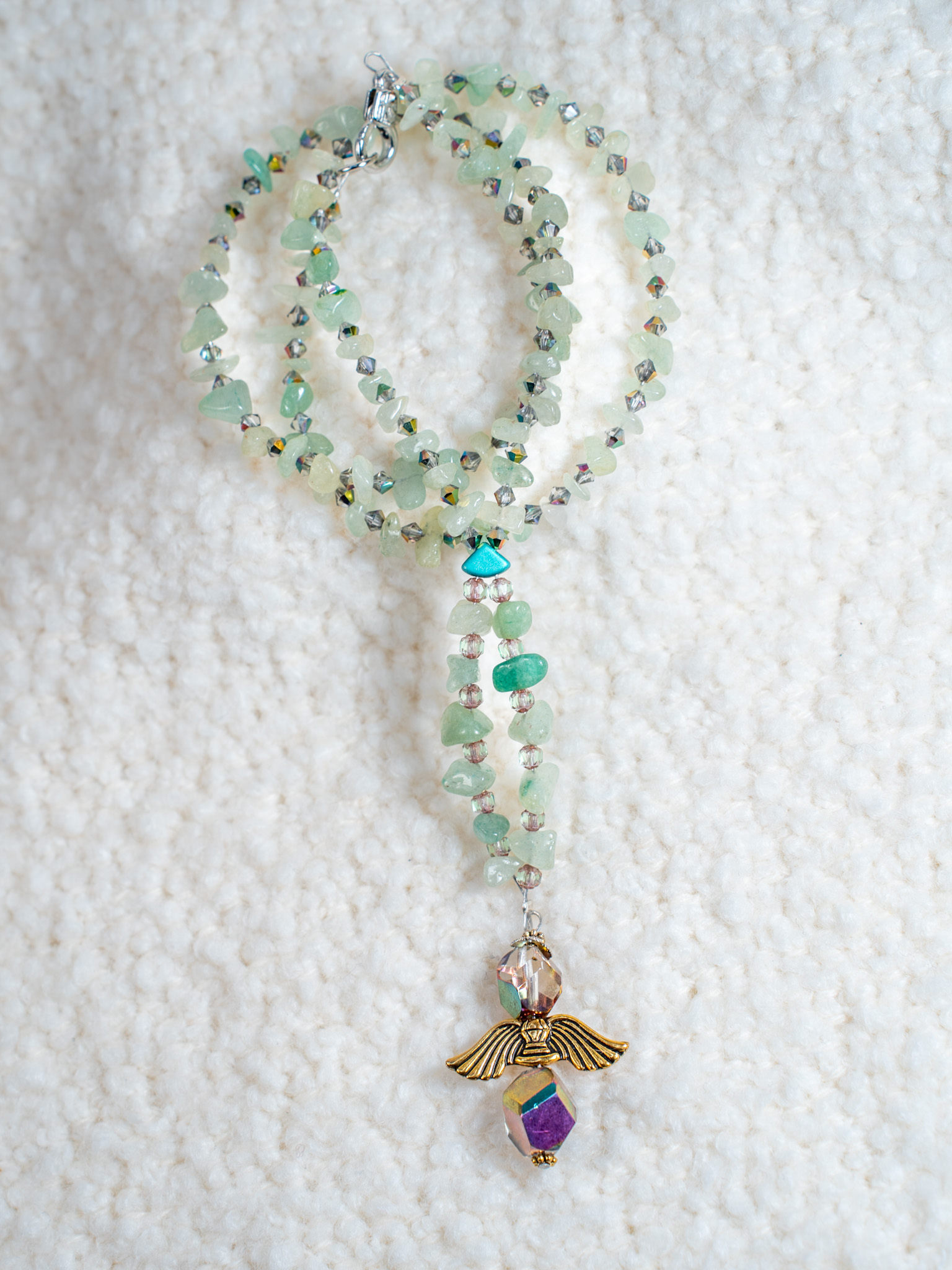 Skleněné krystaly na růženci na krk dodávají jemný lesk a krásně zvýrazňují přírodní tóny avanturínu, vytvářejí doplněk, který můžete nosit jako šperk nebo zavěsit do auta, aby Vám přinesl klid a bezpečnost na každé cestě.