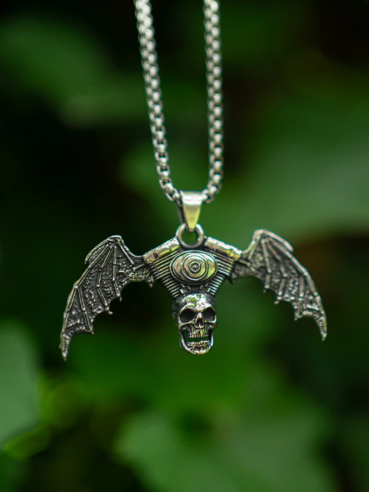 Pánský náhrdelník s motorkářským motivem šperk je symbolem svobody, rychlosti a rebelského ducha. Motor s křídly a lebkou odkazuje na sílu, odvahu a touhu po volnosti.