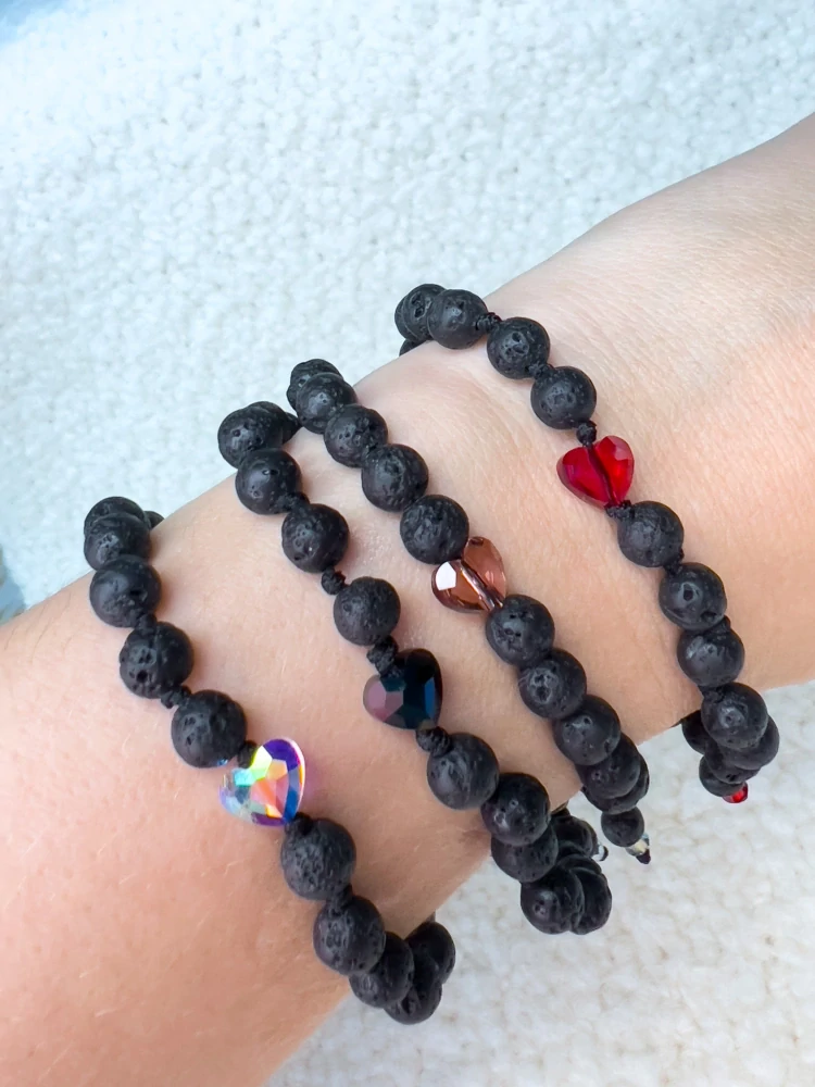 Náramek kombinuje lávové kameny s jemně broušeným krystalem ve tvaru srdce od jedinečné značky Swarovski. Lávové kameny symbolizují sílu a stabilitu, zatímco Swarovski srdce představuje čistotu a lásku. Tato harmonická kombinace materiálů je ideálním vyjádřením Vašeho vztahu a propojení, ať už jde o romantického partnera, přítele, nebo člena rodiny.