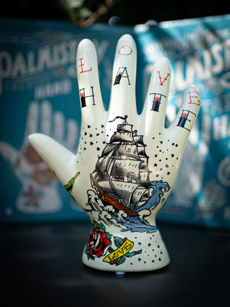 Keramická soška Hand Hate - dekorativní tetovaná chiromantická ruka.