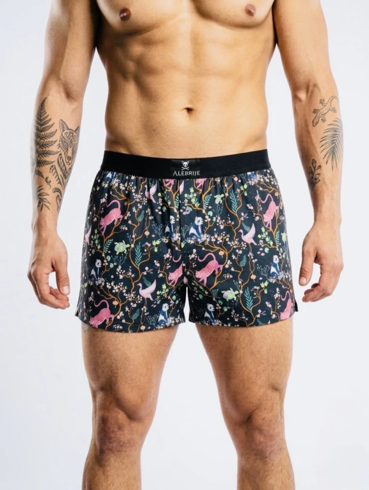 Základem je 100% bavlna. Je to klasický materiál, který dýchá, je měkký a příjemný na kůži po celý den. Střih je navržený tak, aby nikde netáhl a neškrtil. V pase je pružná černá guma s decentním logem Alebrije, která drží, ale netlačí.