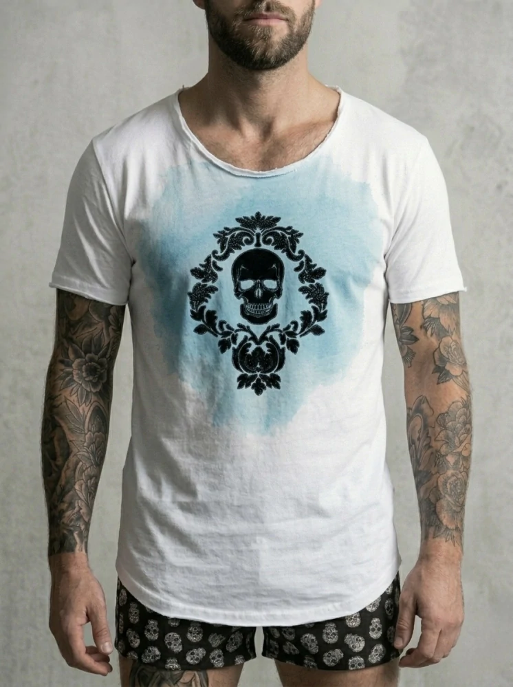 Naše tričko ze 100% bavlny s motivem camey lebky je malováno ručně, takže každý kus je originál.