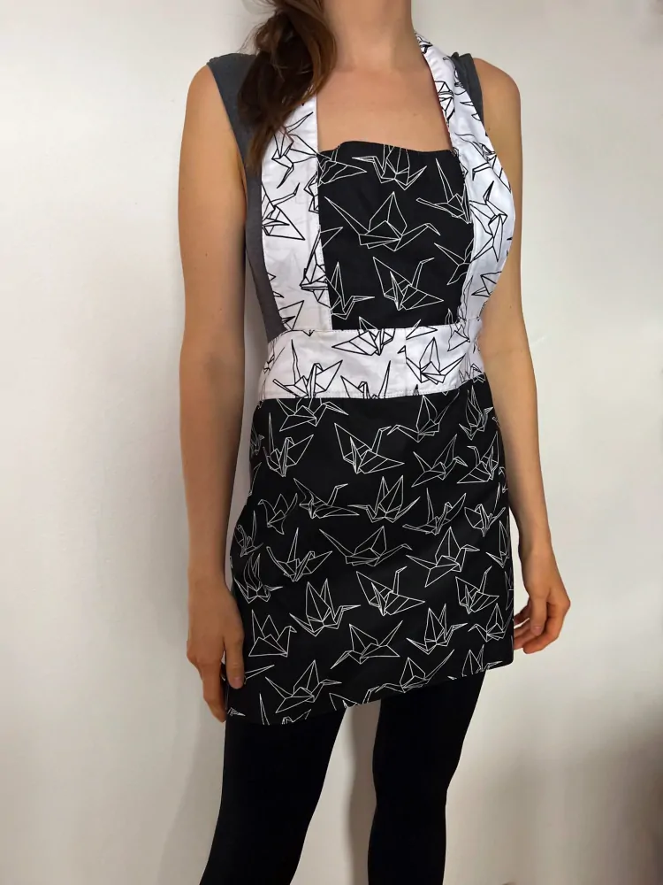 Zástěra na vaření Origami symbolizuje tradiční japonskou uměleckou techniku skládání papíru do různých tvarů a vzorů, které mohou představovat rozmanitost geometrických tvarů, květin, zvířat a dalších přírodních motivů.