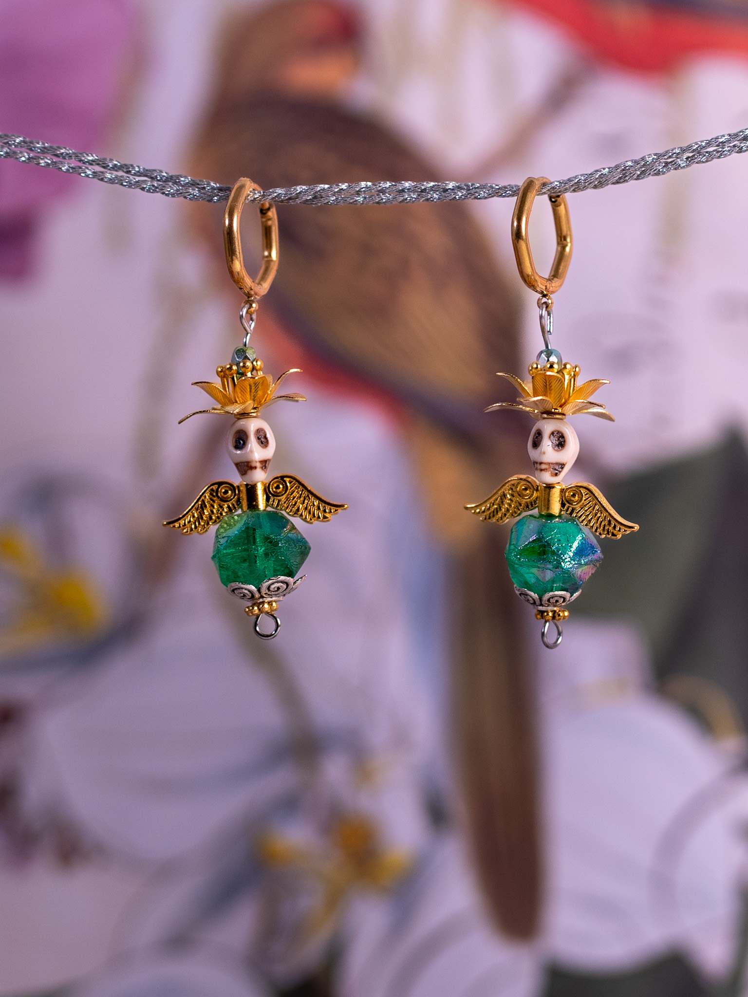Dominujícím prvkem těchto náušnic je lebka s zlatou korunou v kombinaci s zeleným krystalem. Světlá lebka v kombinaci s zeleným krystalem a zlatou květinovou květinou. Luxusní Mexický styl, kontrast lebky a květin.